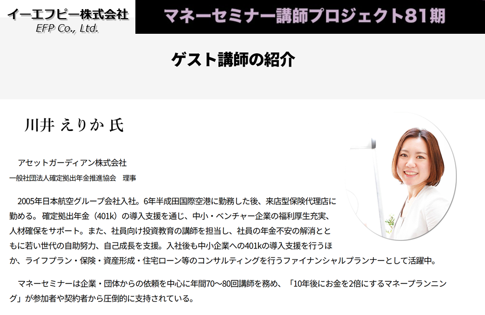 イーエフピー株式会社様(東京都中央区)にて、ファイナンシャルプランナーの川井えりかが「マネーセミナー講師プロジェクト81期」のゲスト講師をしました!